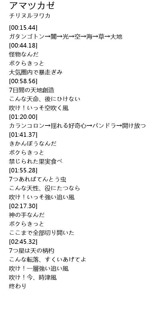 | [01:27.30] | カランコロン→揺れる好奇心→パンドラ→開け放つ |