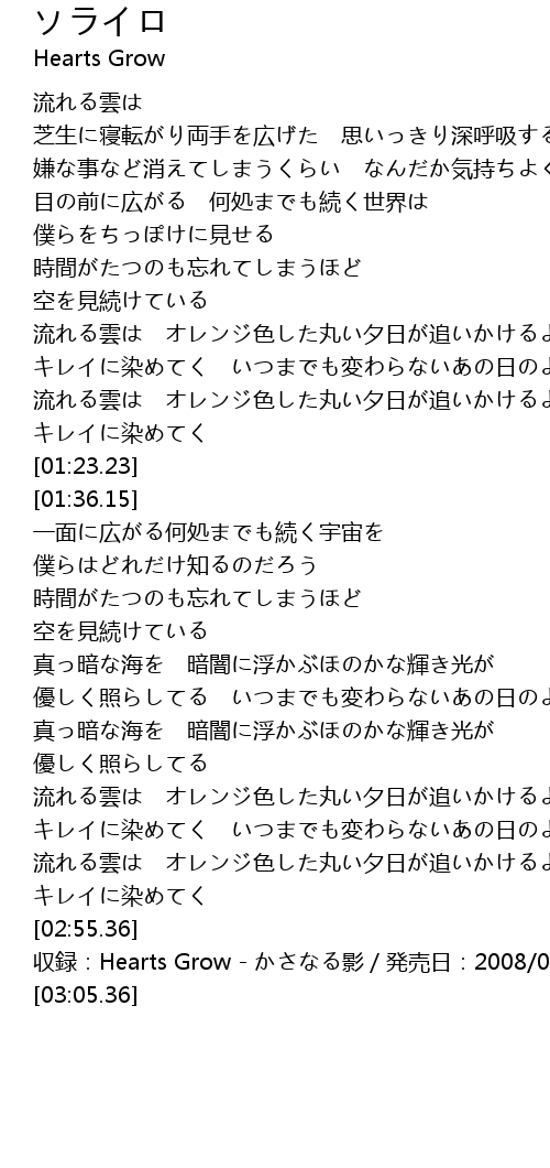 | [02:57.36] | 収録:Hearts Grow - かさなる影/発売日:2008/01/23 |