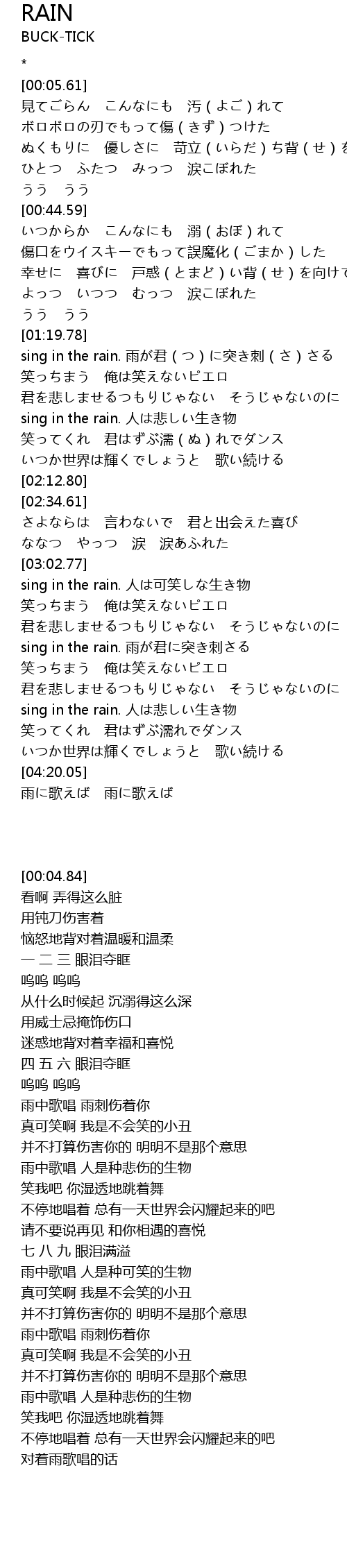 | [01:21.93] | sing in the rain. 雨が君(つ)に突き刺(さ)さる |