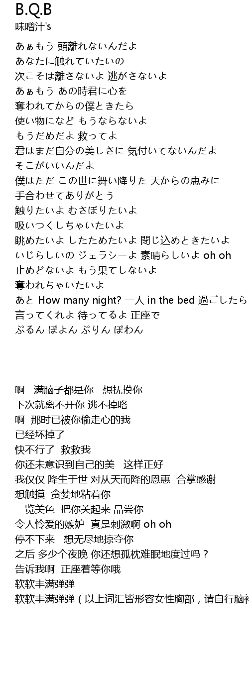 | [02:30.99] | 软软丰满弹弹 软软丰满弹弹(以上词汇皆形容女性胸部,请自行脑补) |