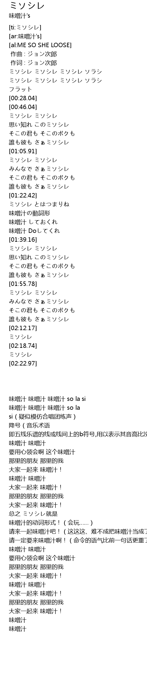 | [00:01.08] | 味噌汁 味噌汁 味噌汁 so la si |