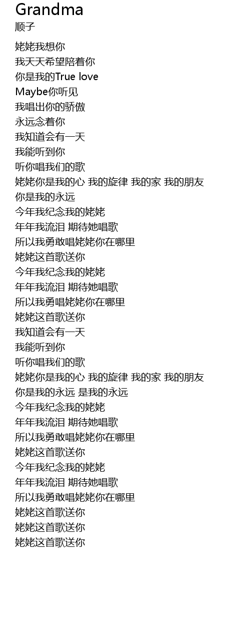| [03:12.580] | 姥姥你是我的心 我的旋律 我的家 我的朋友 你是我的永远 是我的永远 |