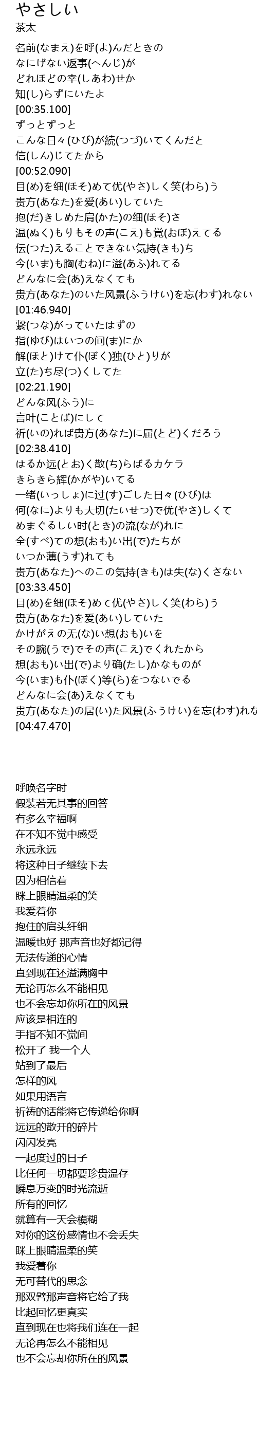 | [03:53.250] | 目(め)を细(ほそ)めて优(やさ)しく笑(わら)う |