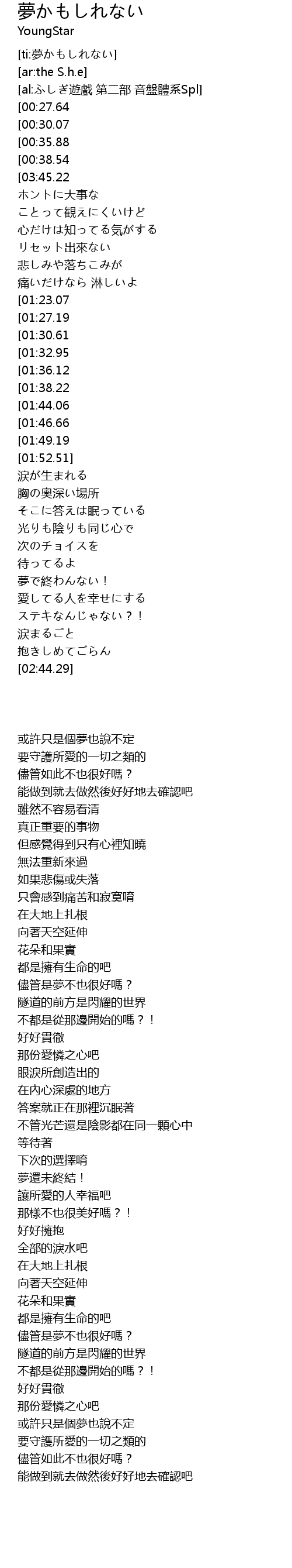 | [03:28.53][00:27.64] | 夢かもしれない |