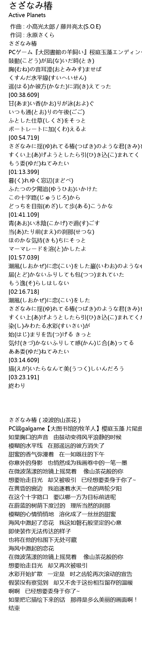 | [00:55.249] | さざなみに揺(ゆ)れてる椿(つばき)のような君(きみ)を |