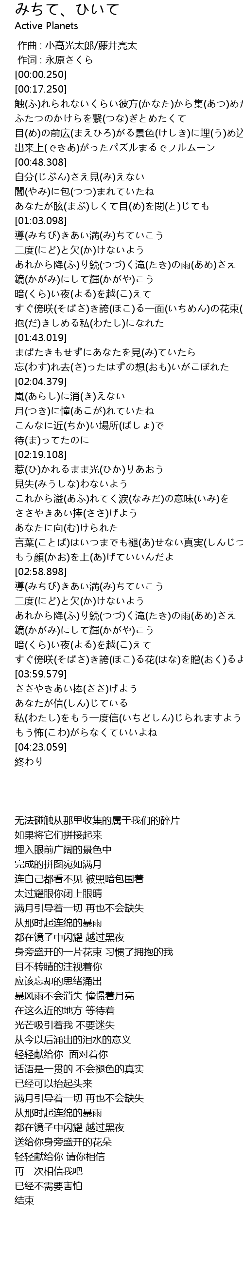 | [01:04.269] | 導(みちび)きあい満(み)ちていこう 二度(にど)と欠(か)けないよう |