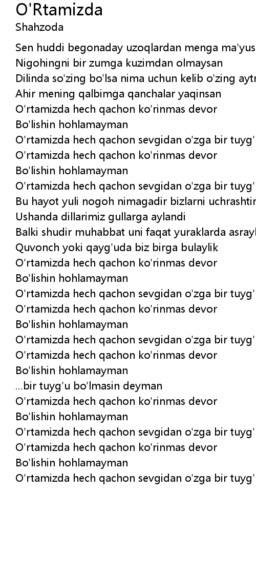| O'rtamizda hech qachon sevgidan o'zga bir tuyg'u bo'lmasin deyman | |