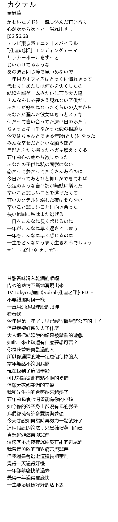 | [00:14.76] | テレビ東京系アニメ「スパイラル ―推理の絆―」エンディングテーマ |