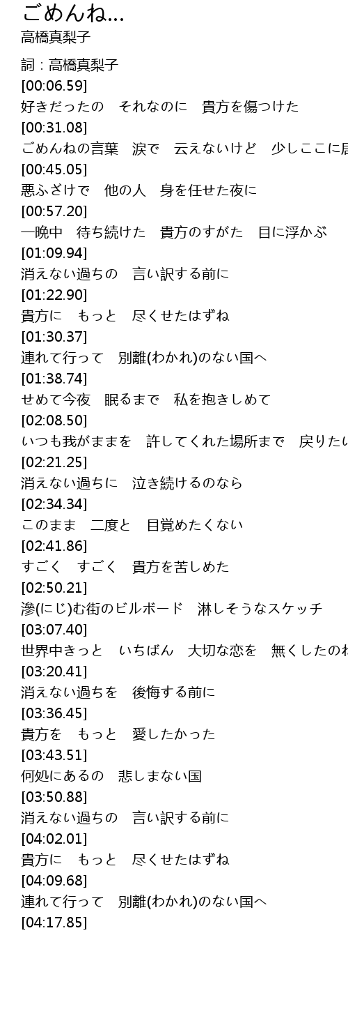 | [00:34.20] | ごめんねの言葉 涙で 云えないけど 少しここに居て |