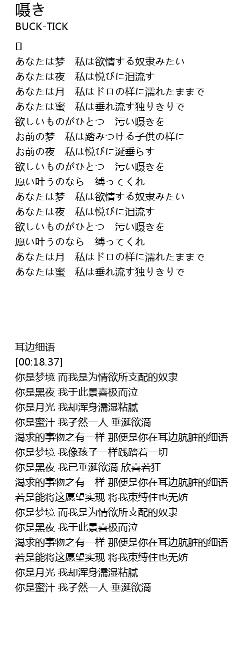 | [02:09.70] | 渴求的事物之有一样 那便是你在耳边肮脏的细语 |