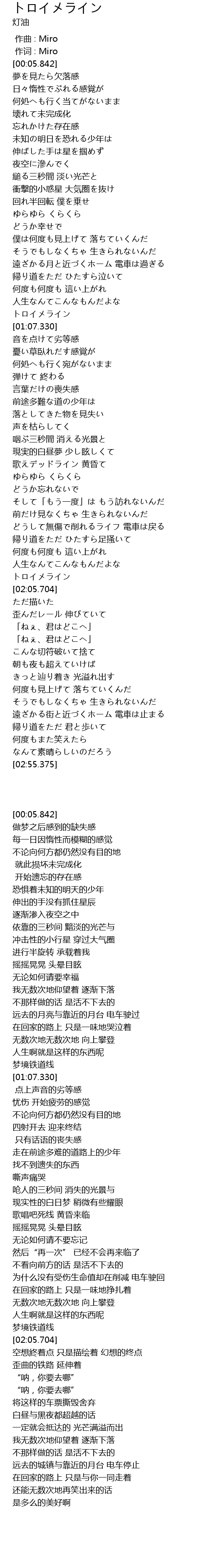 | [02:42.883] | 远去的城镇与靠近的月台 电车停止 |