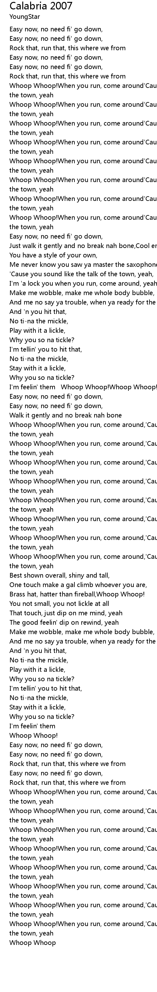 Whoop Whoop!When you run, come around'Cause I know you're the talk of the town, yeah |