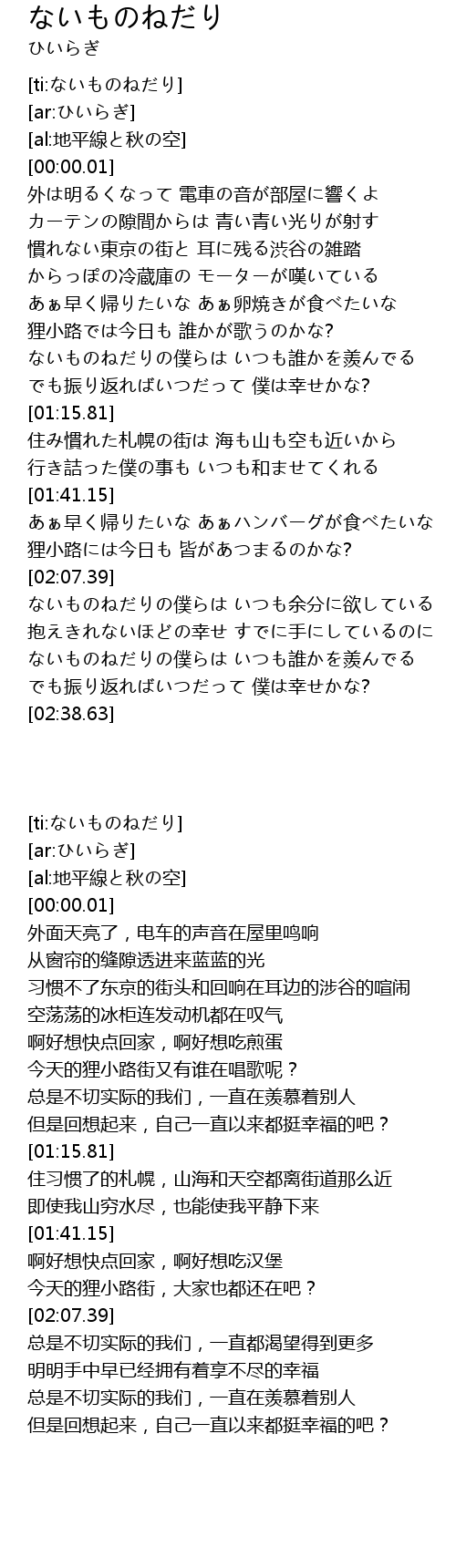 | [02:25.72] | ないものねだりの僕らは いつも誰かを羨んでる |