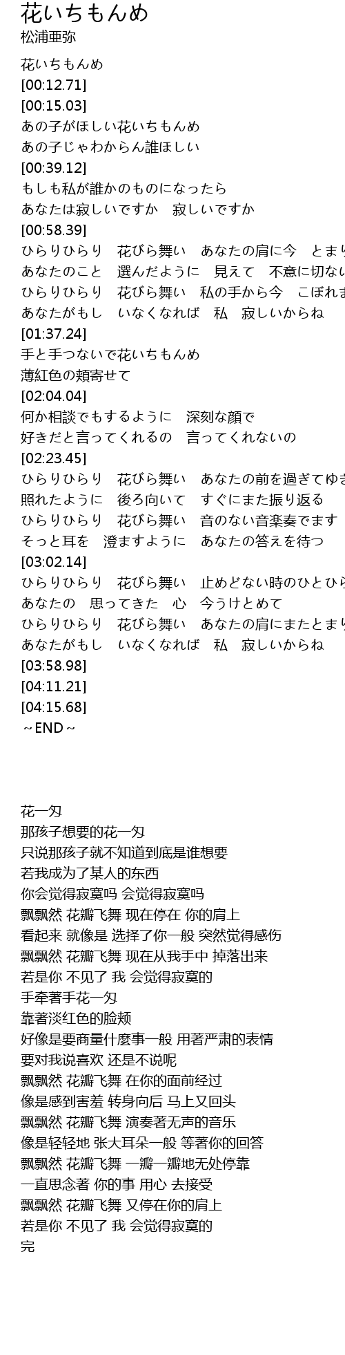 | [03:21.22] | ひらりひらり 花びら舞い 止めどない時のひとひらごと |