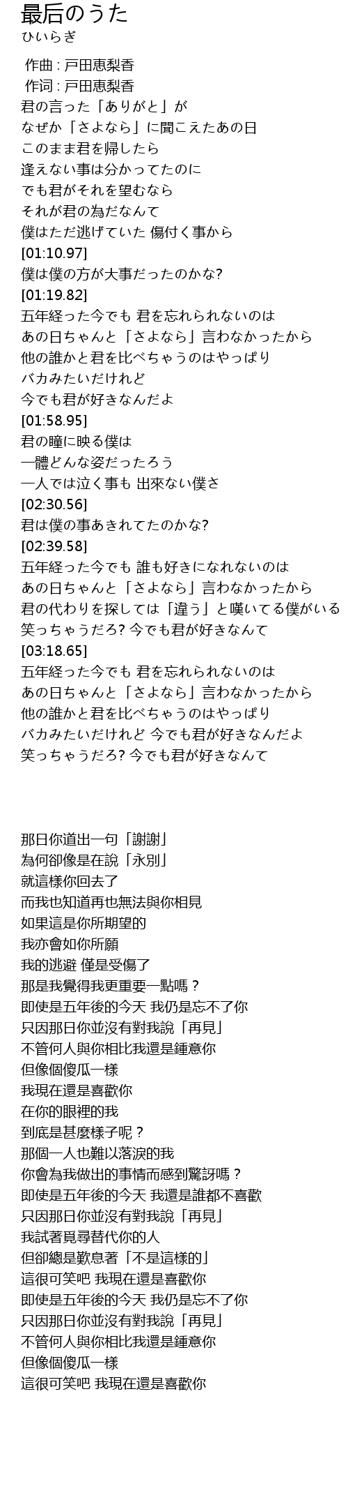 | [03:56.37] | あの日ちゃんと「さよなら」言わなかったから |