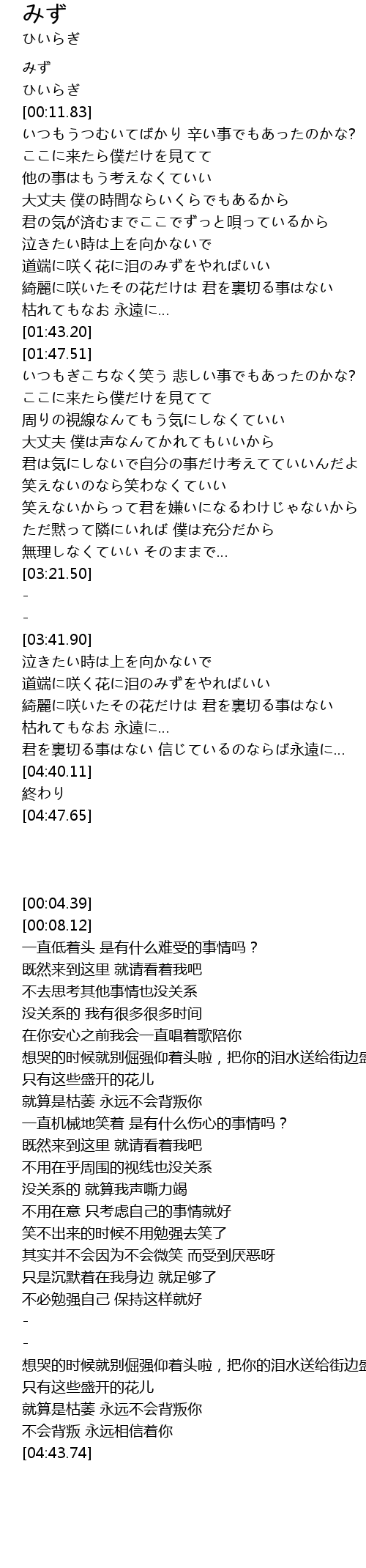 | [03:52.89] | 泣きたい時は上を向かないで 道端に咲く花に泪のみずをやればいい |