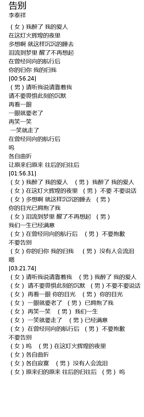 | [03:53.55] | (女) 在曾经同向的航行后 (男) 不要抱歉 不要告别 |