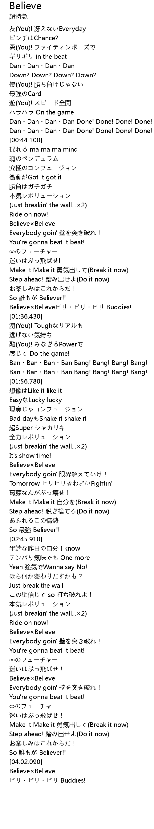 | [01:33.570] | Believe×Believeビリ・ビリ・ビリ Buddies! |