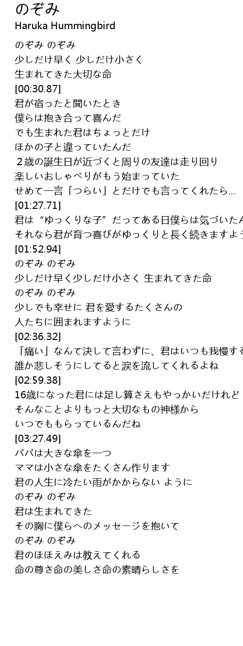 | [03:58.46] | 君は生まれてきた その胸に僕らへのメッセージを抱いて |