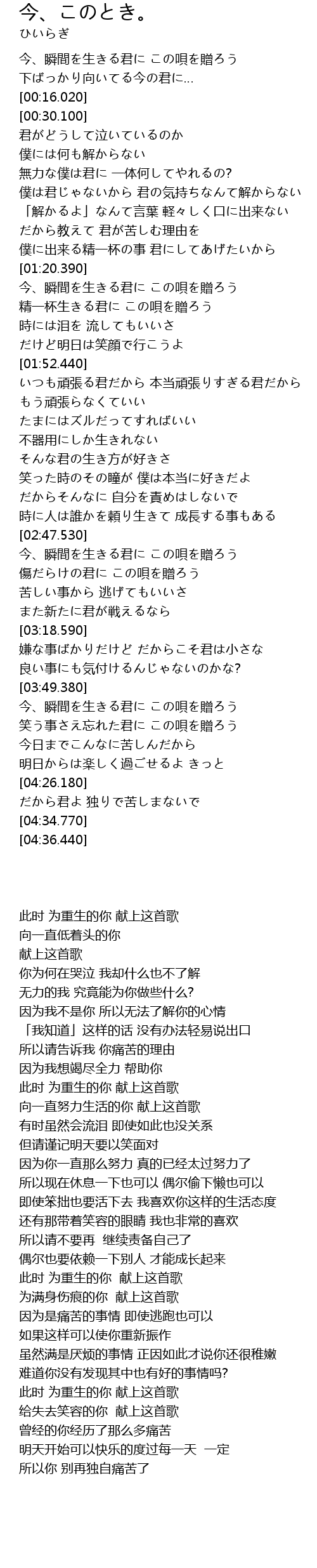 | [00:00.000] | 今、瞬間を生きる君に この唄を贈ろう |