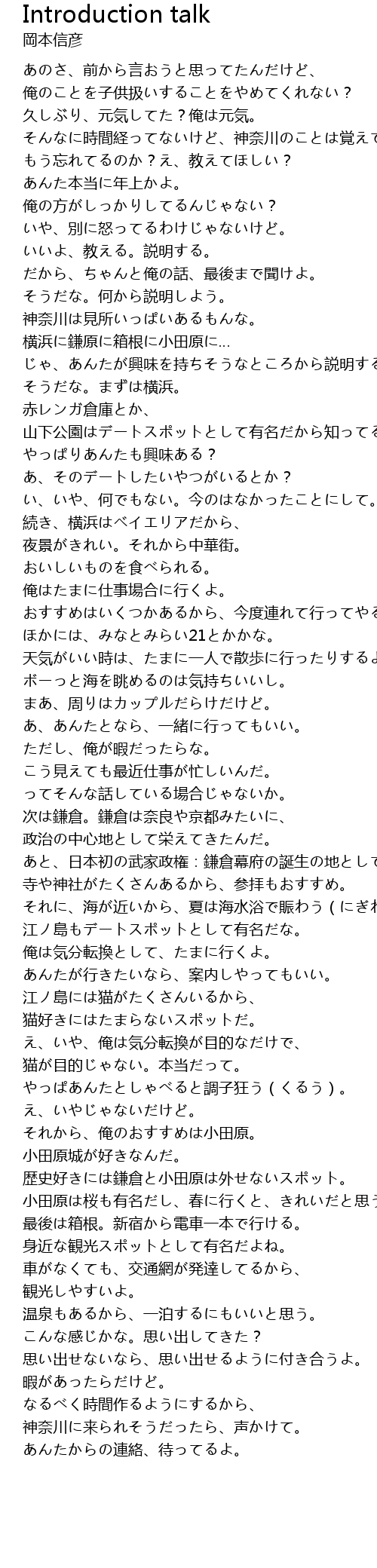 | [00:18.21] | そんなに時間経ってないけど、神奈川のことは覚えてる? |