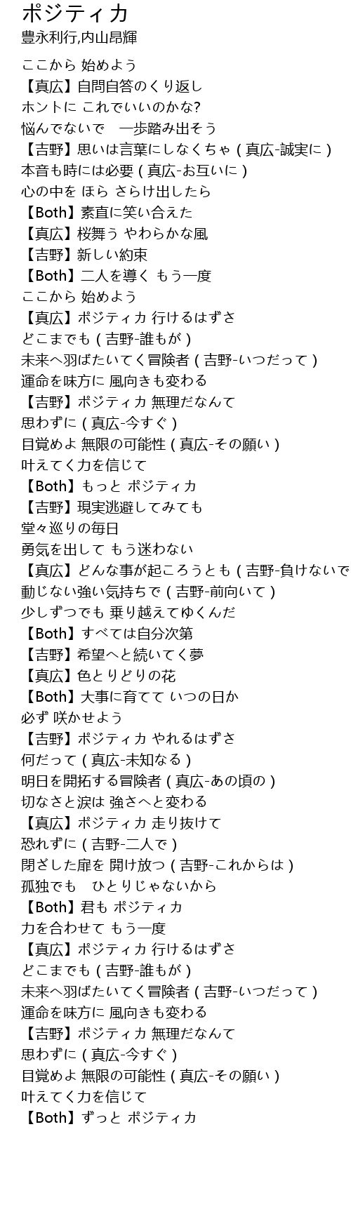 | [03:25.940] | 【真広】ポジティカ 行けるはずさ どこまでも(吉野-誰もが) |