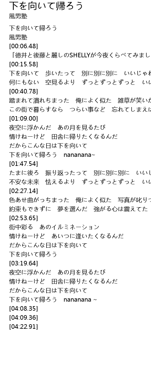 | [03:39.95] | 下を向いて帰ろう nananana ~ |