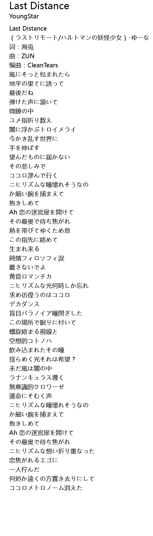 | [00:00.697] | Last Distance (ラストリモート/ハルトマンの妖怪少女)-ゆーな |