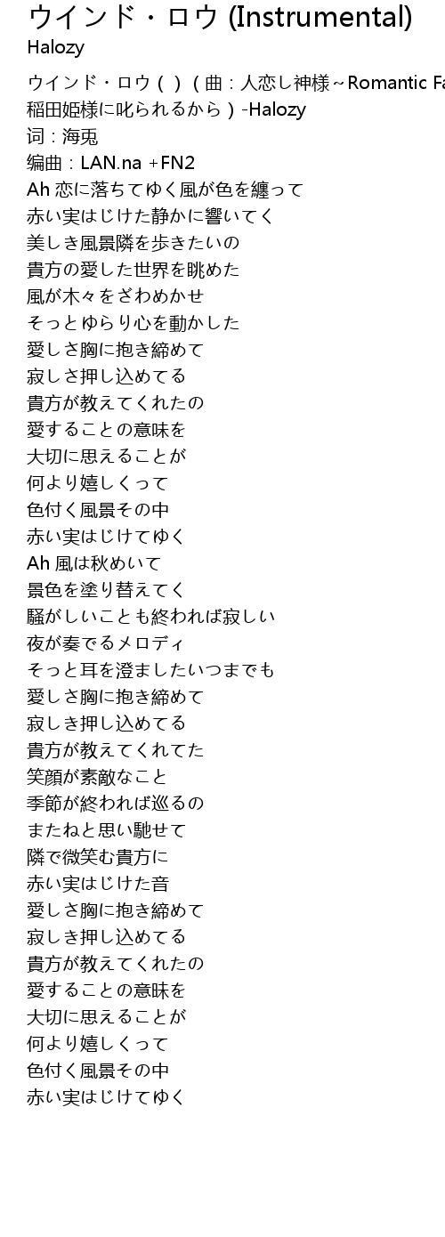 | [00:00.00] | ウインド・ロウ()(曲:人恋し神様~Romantic Fall 稲田姫様に叱られるから)-Halozy |