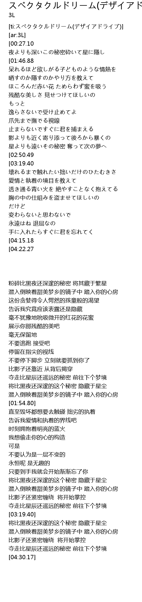 | [01:39.91][02:50.49][04:01.01] | 夜よりも深いこの秘密 星屑に隱して |