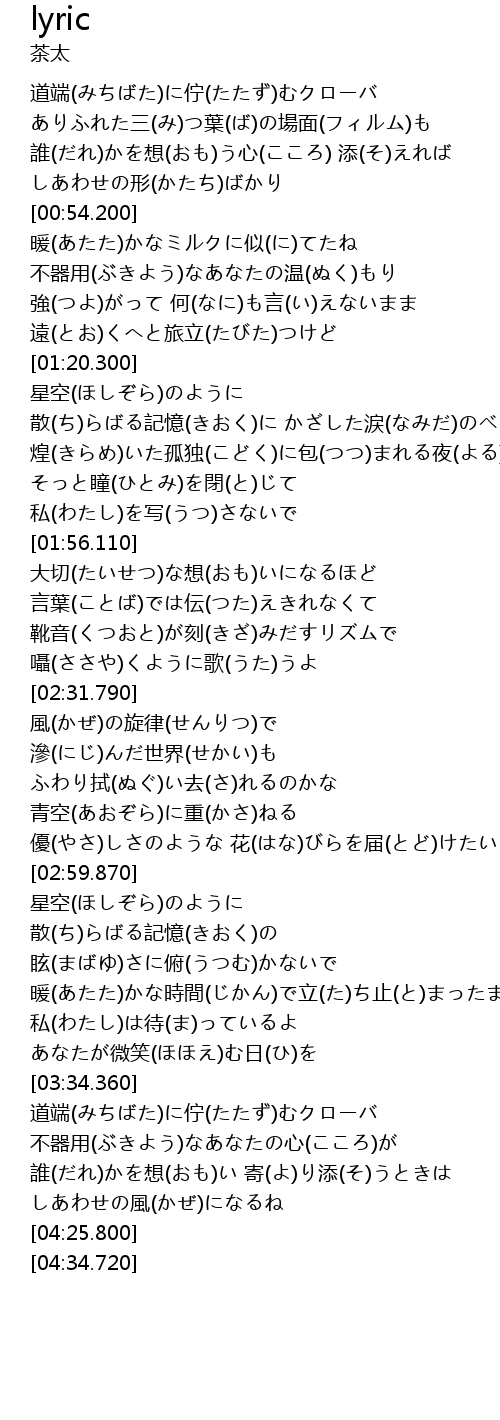 | [04:00.560] | 道端(みちばた)に佇(たたず)むクローバ 不器用(ぶきよう)なあなたの心(こころ)が |