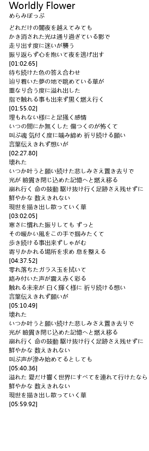 | [02:50.50] | 鮮やかな 数えきれない 現世を描き出し散っていく華 |
