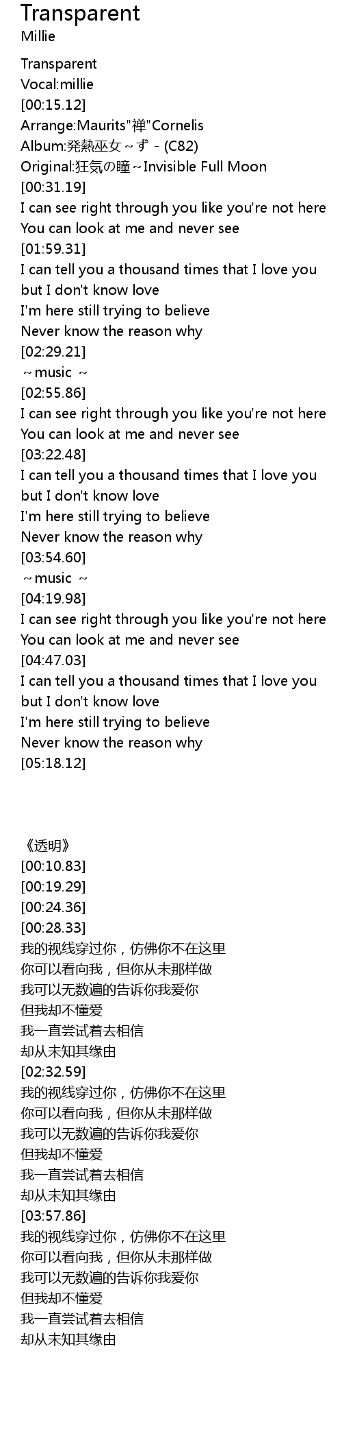 | [02:59.63] | 我的视线穿过你,仿佛你不在这里 |