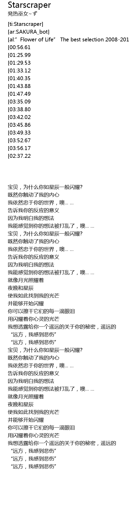 | [02:22.86][02:37.22][04:31.77][05:00.72][05:14.75] | "far away,I feel sadness" |