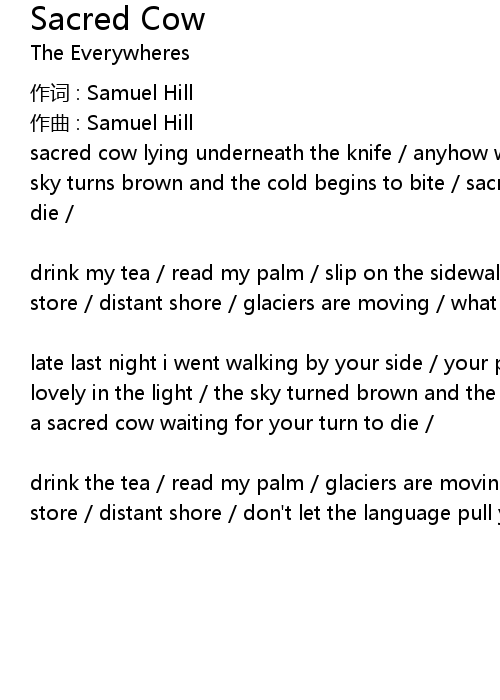 | sacred cow lying underneath the knife / anyhow we don't wanna start a fight / sky turns brown and the cold begins to bite / sacred cow waiting for its turn to die / | |
