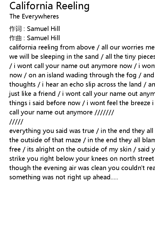 | california reeling from above all our worries melt away beneath the sun soon we will be sleeping in the sand all the tiny pieces slipping through our hands i wont call your name out anymore now i wont say the things i said before now on an island wading through the fog and when i am all alone she reads my thoughts i hear an echo slip across the land and it wraps me in its arms just like a friend i wont call your name out anymore now i wont say the things i said before now i wont feel the breeze i felt before now i wont call your name out anymore | |