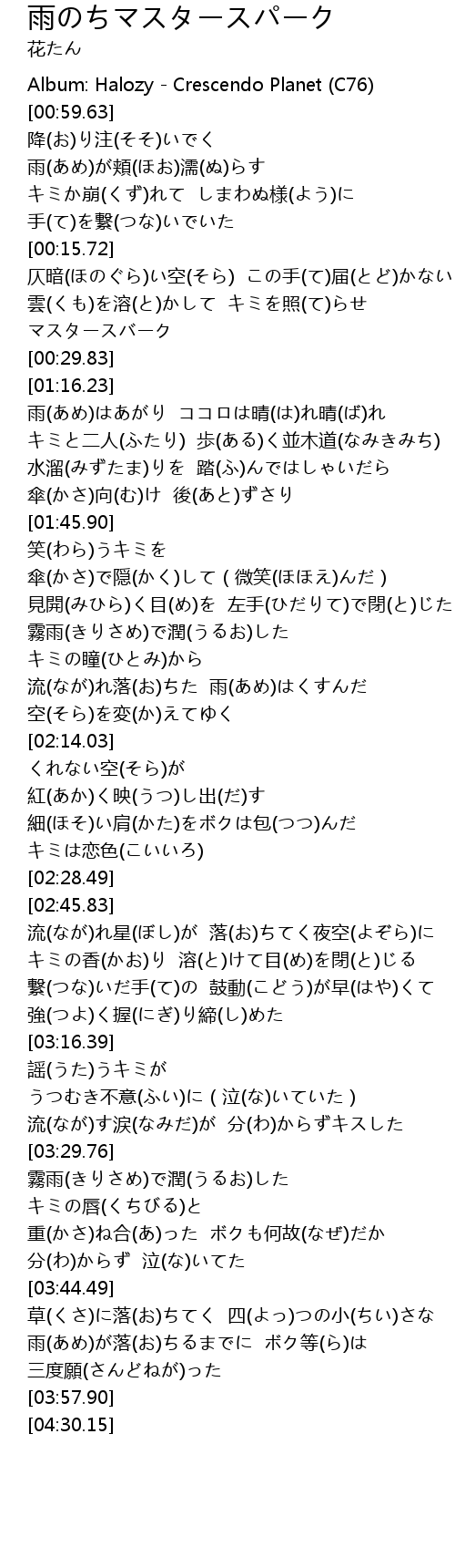| [03:51.88] | 雨(あめ)が落(お)ちるまでに ボク等(ら)は |