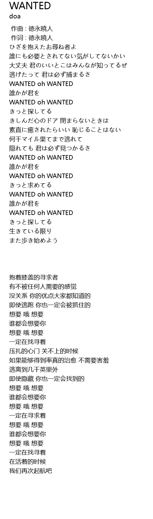 | [00:14.99] | ひざを抱えたお尋ね者よ |