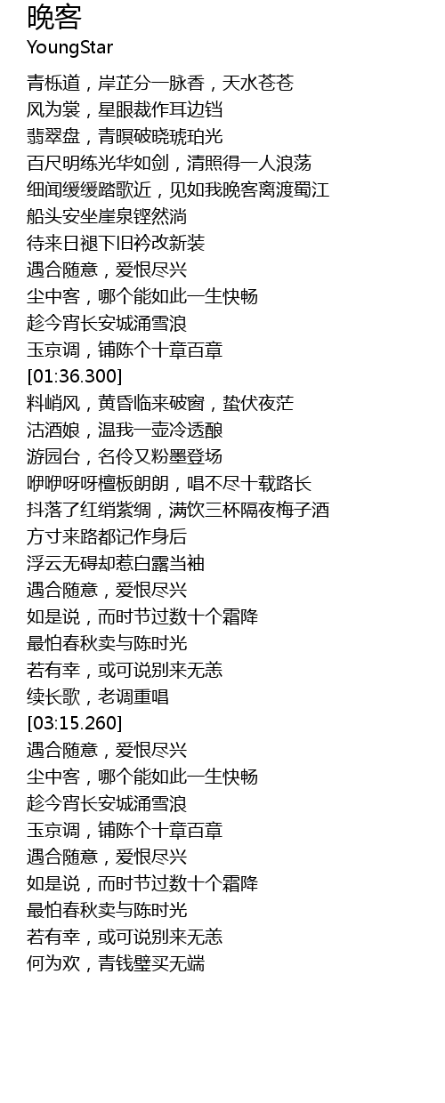 | [00:52.960] | 细闻缓缓踏歌近,见如我晚客离渡蜀江 |