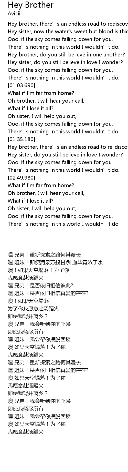 | [02:54.540] | 噢 兄弟,我会听到你的呼唤 |