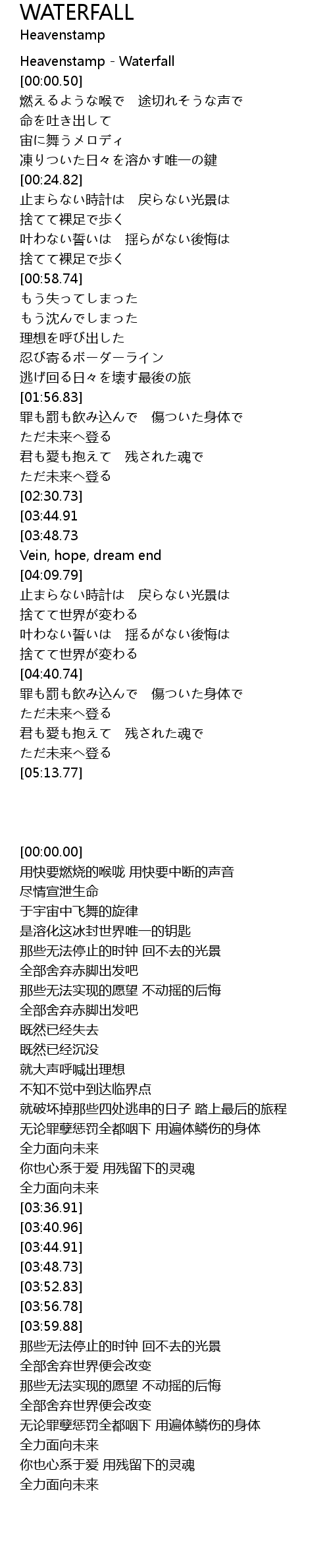 | [03:52.83][03:44.91][03:36.91] | Waterfall in my heart |
