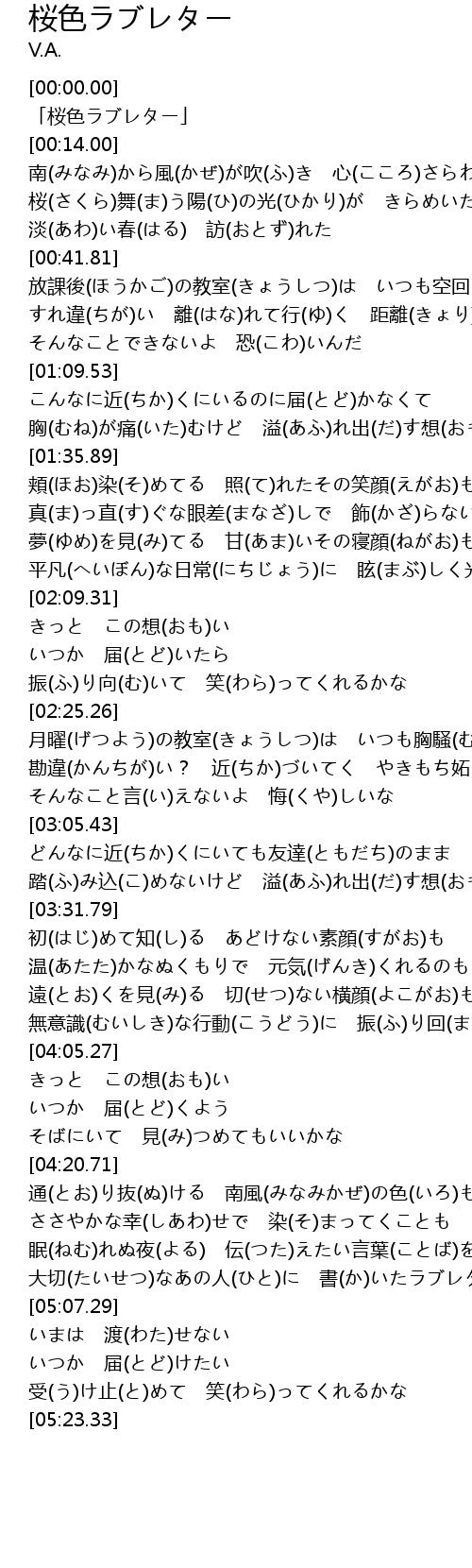 | [04:59.73] | 大切(たいせつ)なあの人(ひと)に 書(か)いたラブレター |
