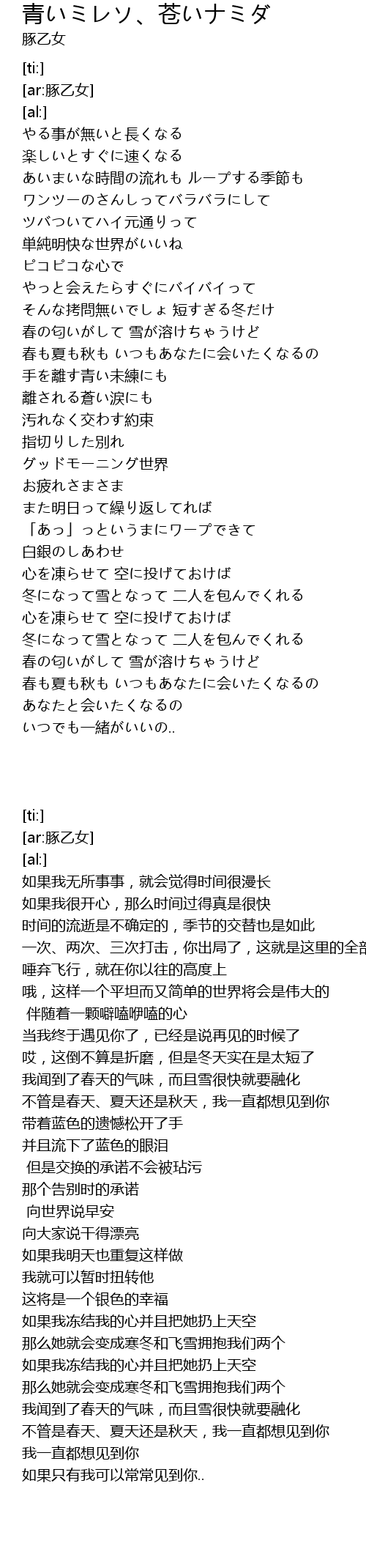 | [00:49.19] | 春の匂いがして 雪が溶けちゃうけど |