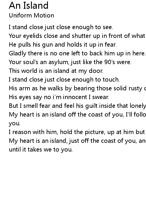My heart is an island off the coast of you, I'll follow you trail until I find you. |