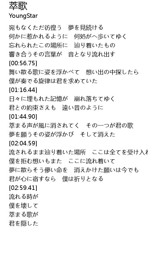 | [01:45.22] | 萃まる声が風に消されてく その一つが君の歌 |