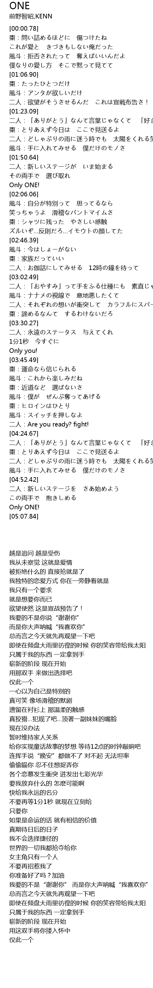 | [01:14.00] | 二人:欲望がそうさせるんだ これは宣戦布告さ! |