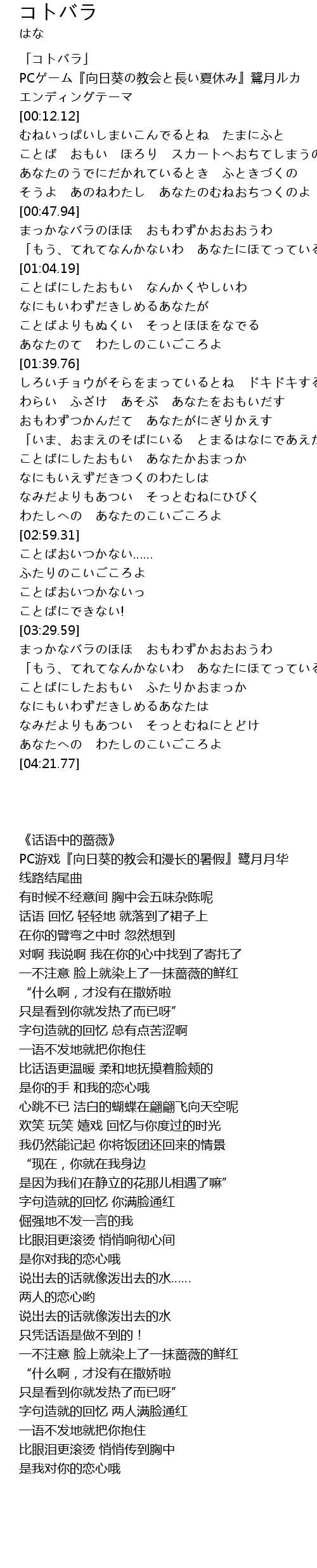 | [00:04.04] | PCゲーム『向日葵の教会と長い夏休み』鷺月ルカ エンディングテーマ |
