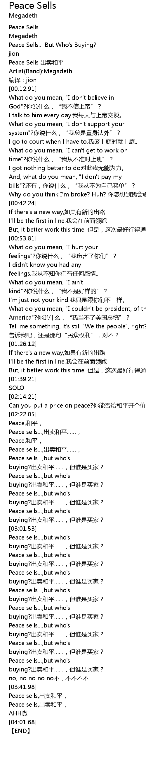 | [02:58.57] | Peace sells...,but who's buying?出卖和平……,但谁是买家? |