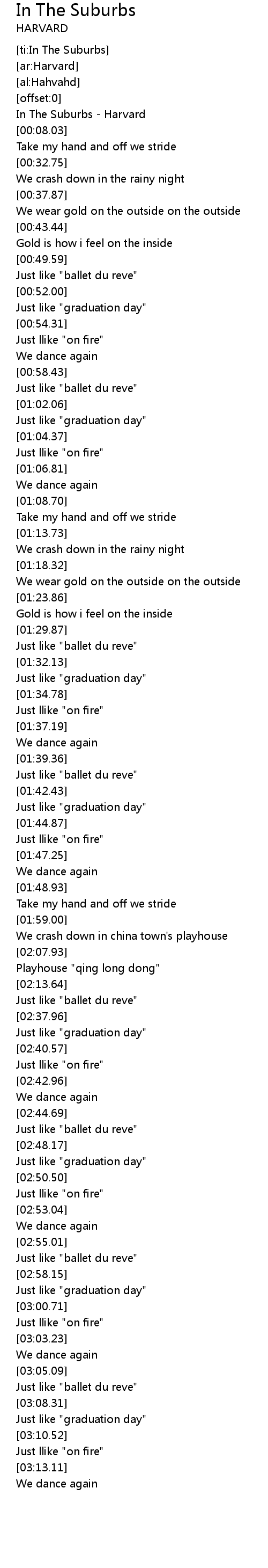 | [00:02.19] | In The Suburbs - Harvard |