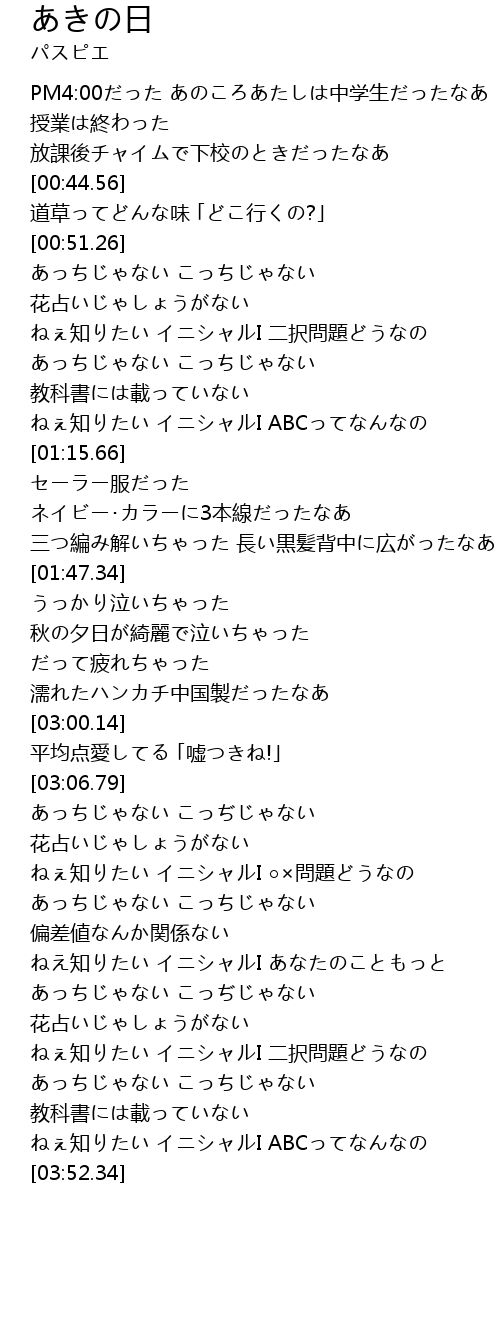 | [00:23.34] | PM4:00だった あのころあたしは中学生だったなあ |